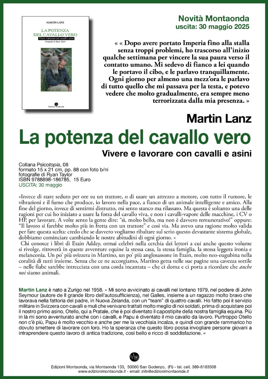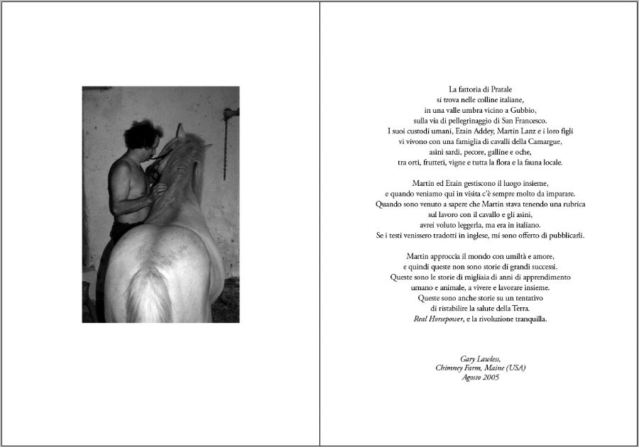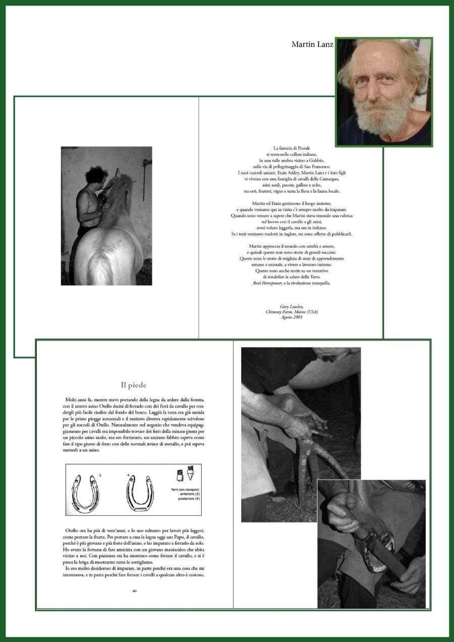 Ma questa è soltanto una delle ragioni per cui ho iniziato a usare la forza del cavallo viva, e non i cavalli-vapore delle macchine, i CV o HP, per lavorare. A volte sento la gente dire: “sì, molto bello, ma non è davvero remunerativo!” oppure: “Il lavoro si farebbe molto più in fretta con un trattore” e così via. Ma avevo una ragione molto valida per fare questa scelta: credo che se davvero vogliamo ribaltare sul serio questo devastante sistema globale, dobbiamo cominciare cambiando le nostre abitudini di ogni giorno.»